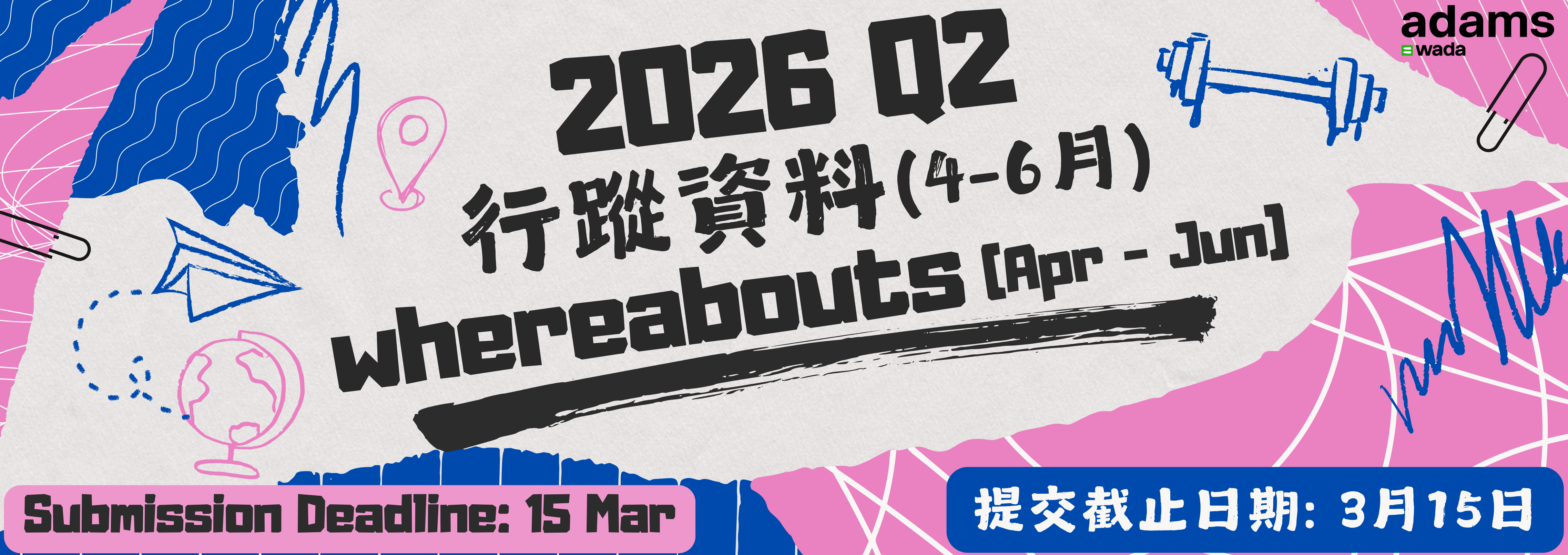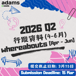 2026Q2 Whereabouts Submission New Interface of DrugInSport ADOHK 2026 Prohibited List ADOHK Anti-Doping Education and Learning platform (ADEL) Update Your Whereabouts DrugInSport The Prohibited List ADAMS Education Resources Latest News ADOHK Newsletter《TrueSelf》(March 2026) 2026-03-03 The 2026 Prohibited List has come into force 2026-01-02 Important Notice: 1st Quarter 2026 Whereabouts Submission Deadline – 15 December 2025 2025-12-09 See more Events Like ADOHK on Facebook Follow ADOHK on Instagram